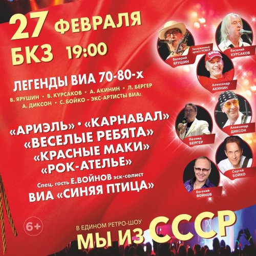 Уважаемые меломаны и ценители советской музыки, готовьтесь пережить незабываемый вечер в сопровождении лучших исполнителей своего поколения! Мы представляем вам юбилейный тур легендарных советских артистов «Легенды ВИА 70-80-х. Мы из СССР»!