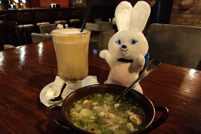 Суп оказался очень вкусным и нежным. Рецепт без сюрпризов: крупные куски картофеля, красная рыба и зеленый лук. Первоначальную радость испортил латте. Он был горьким и приготовленным явно не из хорошего сорта кофе.