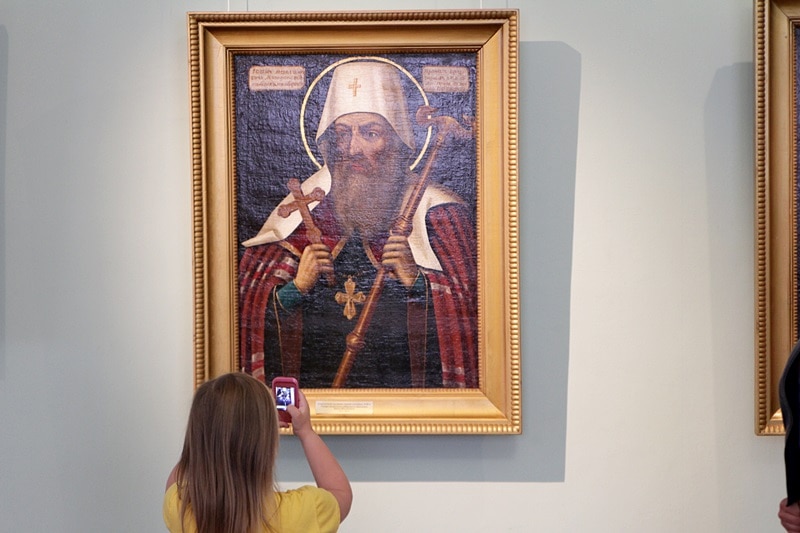 Таких картин здесь много! Например, «Портрет Иоанна Максимовича», митрополита Тобольского и всея Сибири, создан неизвестным авторов в XVIII веке. Он особенно ценен тем, что написан вскоре после смерти известного героя. Вероятно, живописец знал митрополита, и это не икона, а портрет с подлинными индивидуальными чертами Иоанна, сибирского деятеля, жившего три века назад