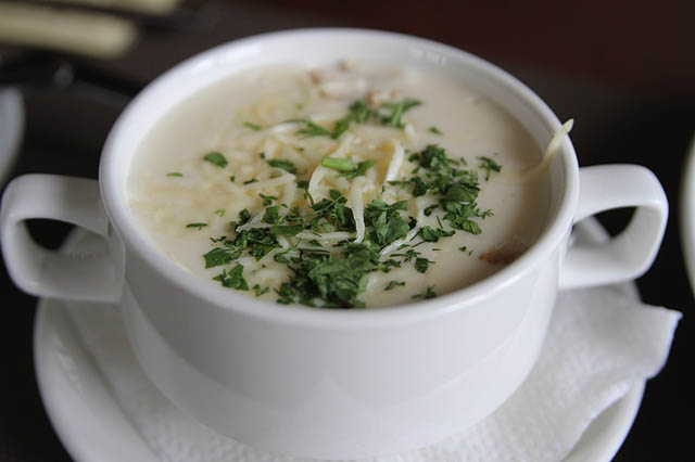 Вариант для тех, кто не любит суп-пюре, но любит сырный суп. Здесь суп достаточно жидкий, с кусочками картофеля и курицы. Подают с сухариками.