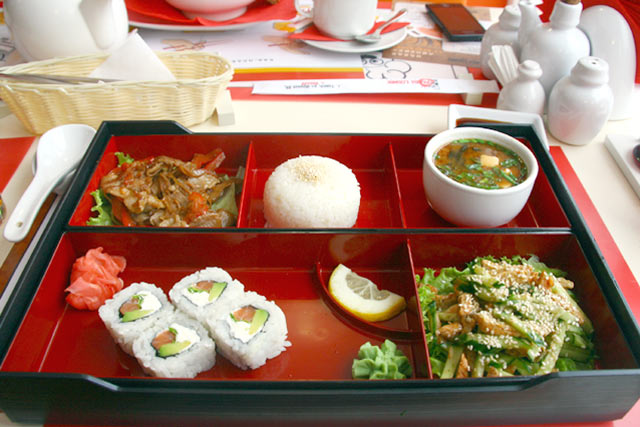 Обеденное меню в ресторане представлено в виде наборов: три «японских» варианта и три обеда «по-домашнему». Напитки на выбор: сок в ассортименте, чай черный и зеленый, а также красное и белое вино. Правда, и свободные позиции тоже представлены в виде простеньких салатов, горячего и супов.