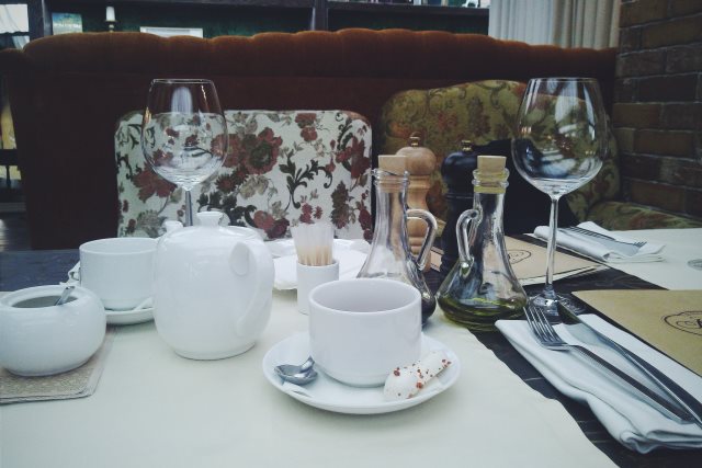 Первое, на что обращаешь внимание — так это на свет. Его здесь так много, словно ресторан размещается на залитой солнечным светом террасе, а не в подвале — такой эффект создает своеобразная система освещения. Светлая мягкая мебель, камин, белые скатерти и сверкающие бокалы на накрытых столиках выдают принадлежность заведения к категории «дорогих». Что ж, проверим.