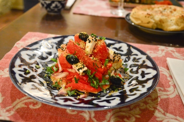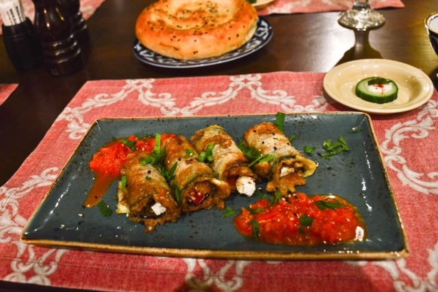 Еда: На ужин мы решили гулять с восточным размахом — и берём салат «Зейтун», рулеты из баклажанов, цыплёнка табака с картофелем и лепёшку с кунжутом.