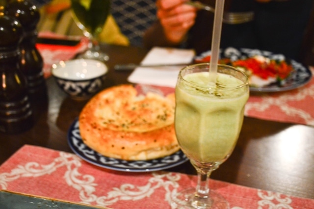 Начнём с напитков: тархун оказывается приятным, освежающим и не слишком сладким лимонадом без газа. Смузи «Зелёный чай» — чистый восторг: густой коктейль на кокосовой воде, с авокадо, сливками и зелёным чаем, взбитыми на блендере.