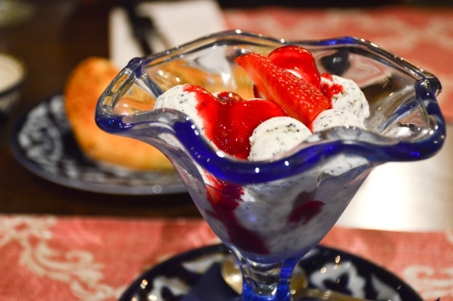 Десерт «Луна Востока» состоит из множества маленьких шариков мягкого пломбира с маком, политых клубничным соусом и украшенных долькой клубники. Сочность ягоды, сливочный вкус мороженого, дробленые зёрнышки мака на языке — кажется, мы бессильны описать, насколько удачным стал выбор этого десерта. За одним только мороженым сюда можно возвращаться ещё и ещё — а заодно попробовать халву, хворост и пахлаву, на которые в «Инжире» выставляют скидку в -50% после девяти вечера.