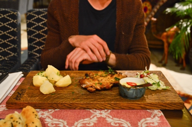 Цыплёнок табака здесь по умолчанию подается с отварным картофелем, соусом и овощами на деревянной доске. Немного подпортило впечатление от блюда лишь его долгое ожидание. Поначалу обещали, что оно будет готово не позже чем через 20 минут после заказа. Мы же прождали раза в два дольше, успев за это время съесть почти всю лепёшку и не удержавшись от соблазна взять домашнее мороженое.