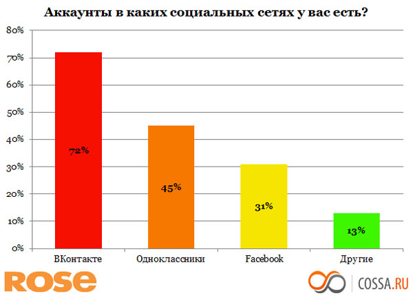 Согласно ему, 89% российских интернет-пользователей имеют аккаунты в социальных сетях; 49% проводят в них от 5 до 10 часов в месяц, а 23% — 20 часов и более. В то время как пользователи сетей из США, Германии и Великобритании, согласно данным исследования comScore, сделанного в 2009 г. — всего лишь 4,5 часа.