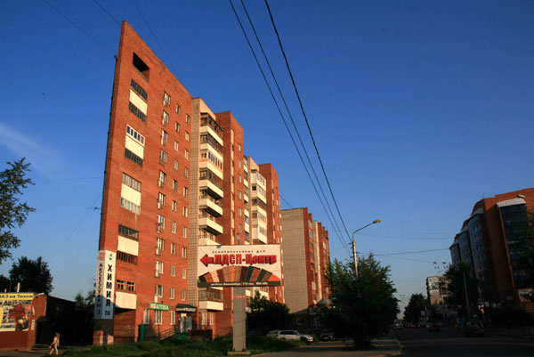 Следующий, на сей раз жилой дом по адресу пр. Ленина, 195, известен своими треугольными балконами, создающими оптическую иллюзию "плоского" дома с одного из торцов здания: