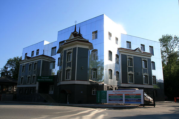 Для тех, кому не хватает привычной деревянной составляющей в современных постройках, видимо и возвели здание Томского Института Бизнеса, что на ул. Заливной, 1 Б (близ пл. Батенькова):