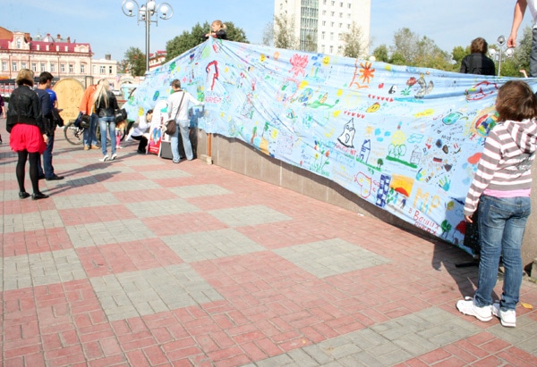 5 сентября - В Томске состоялись сразу два "открытия-презентации". Так, на Новособорной площади томичам представили "Знамя мира": сшитое из отдельных фрагментов полотнище достигало 15 метров в длину. Знамя составлено из фрагментов голубой ткани, на которых изобразили свое видение мира дети из Томска и области. Акция проходила в течение 2-х месяцев под патронатом областного Молодежного парламента. Лучшие работы "уехали" в Шанхай, чтобы стать частью единого российско-китайского "Знамени мира".