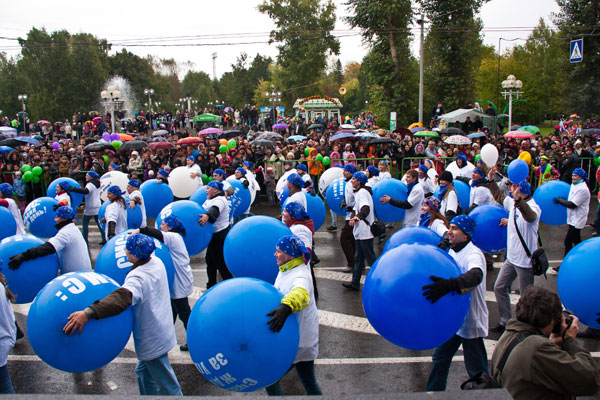 18 сентября - В Томске прошел V городской карнавал "Золотой шар". Название говорит само за себя - тематика нынешнего карнавала преполагала, что все его участники могут использовать различные вариации оформления колонн с помощью воздушных шаров. Результат превзошел все ожидания - сотни разноцветных воздушных шаров и тысячи зрителей, несмотря на суровую сибирскую осень, щедро "одарившую" в этот день всех собравшихся сильным ветром и дождем.