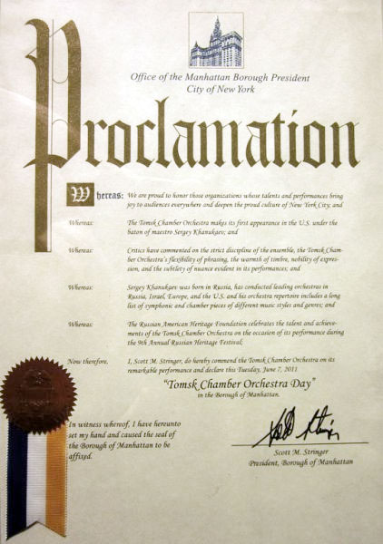 Выступление настолько понравилось и хозяевам фестиваля, что глава администрации Манхэттена Скотт Стрингер провозгласил 7 июня днем томского камерного оркестра в районе Манхеттен. В его письме томскому оркестру говорится: «Критики отметили строгую дисциплинированность группы музыкантов, плавность исполнения, теплоту тембра, благородство выражения. Настоящим воздаю честь томскому оркестру по случаю его яркого, запоминающегося выступления и провозглашаю 7 июня днем томского камерного оркестра в районе Манхеттен».