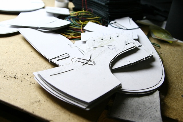 Сначала закройщики по лекалам, которые разработал модельер, выкраивают из цельного куска кожи отдельные детали. Раскройные детали комплектуются по размерам, кроят их по моделям.