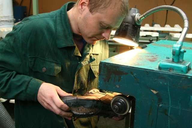 Разогретые заготовки попадают на конвейер и медленно передвигаются к следующему этапу производства: обрисовке подошвы. Это делают для того, чтобы неровные борта подошвы располагались точно на своих местах. Чтобы все приклеилось идеально, нижнюю часть заготовки ботинка обтачивают. Операция называется «шкуровка по плоскости».