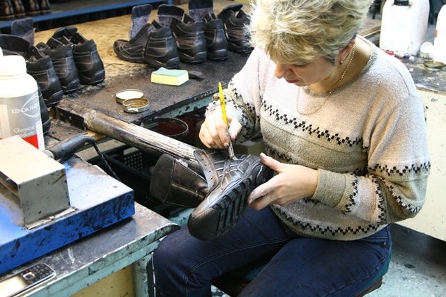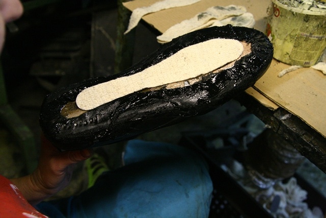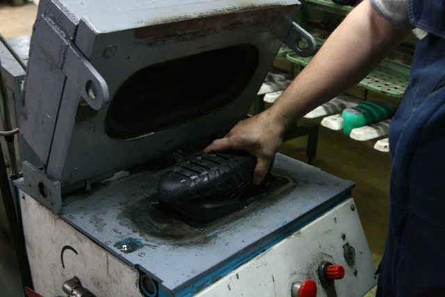 Неподалеку сидит работник, который в это время обмазывает пластиковую подошву обезжиривающим средством. Затем на обточенную заготовку нанесут обувной клей и прессом прижмут к подошве.