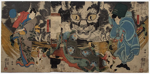 Согласно японскому фольклору, при определенных условиях любая кошка может стать демоном-оборотнем. Для этого нужно всего-то: 1) прожить более тринадцати лет 2) набрать вес больше 3,75 кг, либо 3) иметь длинный хвост. Видимо, это настолько привычные для японцев метаморфозы, что неудивительно, например, существование такой шутливой песенки: