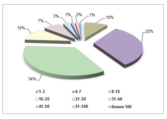 В условной "средней" веб-студии по-прежнему работают от четырёх до пятнадцати человек, её портфолио насчитывает от десяти до пятидесяти проектов. При этом московские веб-студии имеют в среднем больший штат и больший размер портфолио.