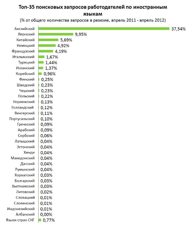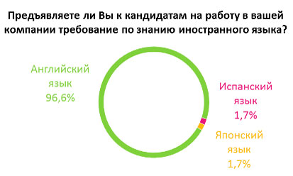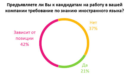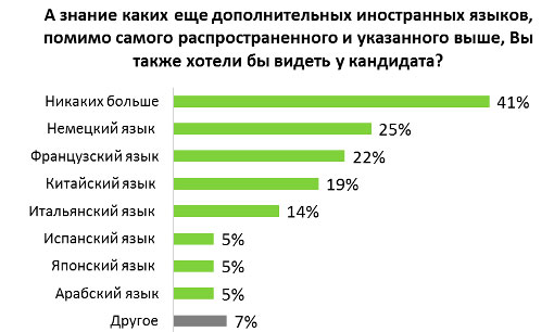 Согласно онлайн-опросу, проведенному HeadHunter, лишь каждый 5-й работодатель предъявляет к кандидатам требование по знанию иностранного языка. При этом практически половина это делает в зависимости от позиции, на которую ищет сотрудника. Не предъявляют никаких требований к работодателям только 37% представителей компаний.