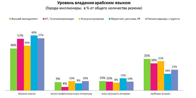 Арабский язык соискатели знают либо на уровне базовых знаний, либо свободно им владеют. В сферах «Высший менеджмент», «ИТ, Телекоммуникации» и «Консультирование» соискателей, которые свободно владеют японским языком, более 1/3-ти.