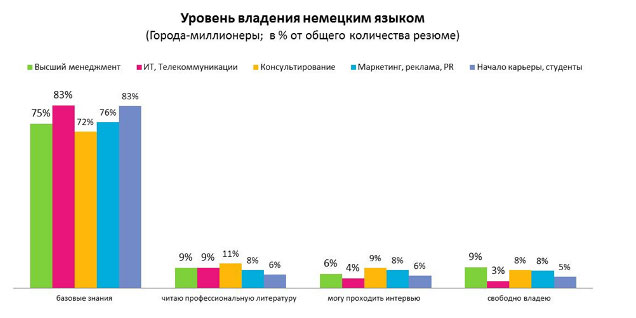 Уровень владения немецким языком у многих соискателей находится на базовом уровне (более 70%). При этом лишь 3% соискателей из ИТ-отрасли отметили в своем резюме, что свободно владеют немецким языком. Для сравнения, в сфере «Высший менеджмент» таких 9%. Владение на уровне чтения профессиональной литературы и прохождения интервью преобладает у соискателей из сферы «Консультирование».
