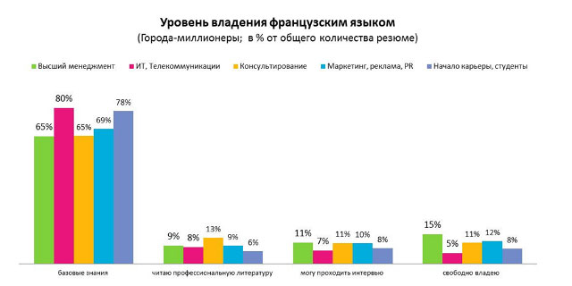 Уровень владения французским языком у многих соискателей также находится на базовом уровне (более 63%), при этом чаще всего подобное знание языка встречается в сфере «ИТ, Телекоммуникации» (80%) и в сфере «Начало карьеры, студенты» (78%).