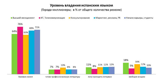 Свободное владение испанским языком чаще всего встречается также в сфере «Высший менеджмент», а реже – в ИТ-сфере. Базовые знания испанского языка чаще всего указывают в своем резюме представители ИТ-сферы (76%), реже – сферы «Консультирование» (63%).