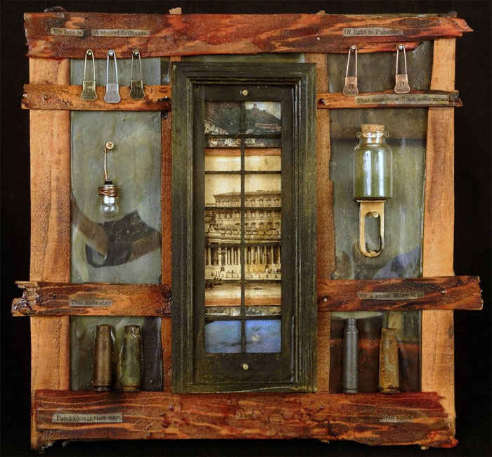Лесли Лукош в своих настенных арт-объектах объединяет и разные техники - от пайки металлов до энкаустики, и разные идеи. Но все они сводятся к одному знаменателю - поиску внутреннего я, или истинного лица. Поэтому, по словам Лесли, в ее последних работах так часто всплывает тема лабиринта. Сквозь странные окна на зрителей смотрят обрывки воспоминаний, кусочки чьих-то жизней и знаки судьбы, принимающие облик то старых карт, то открыток из прошлого: