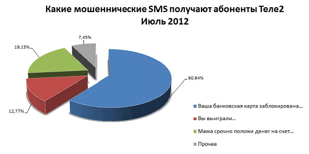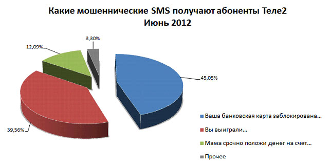 Как сообщил оператор сотовой связи Tele2, ежемесячно в звонковом центре фиксируется порядка 300 обращений с жалобами на SMS мошенников. Несмотря на все многообразие возможных вариантов SMS, мошенники в основном используют 4-5 приемов. Около половины сообщений сообщают, что банковская карта заблокирована и для разблокировки необходимо позвонить в службу поддержки. При звонке на указанный номер у человека запрашивают пин-код карты, после чего с нее исчезает приличная сумма денег. Около 40% мошенников сообщают о выигрыше абонента для подтверждения выигрыша просят отправить SMS на платный номер. 12% мошенников пользуются банальным «мама я в беде» и лишь 3% мошенников экспериментируют и изобретают новые механизмы.