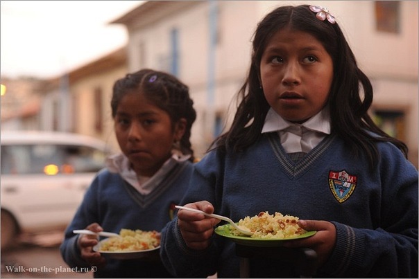 В Перу: "В вечернее время я искал дешёвое питание, и повстречал женщину, сидящую на ступеньках большого старого здания, и продающую вкусный рис со специями всего по 6 руб за порцию. Взяв одну, и присев рядом на ступеньки, через минуту, когда закончились занятия в школе, из здания вывалила детвора, и рванула к кухарке. Так, я оказался беспросветно окружён детьми с тарелочками риса."