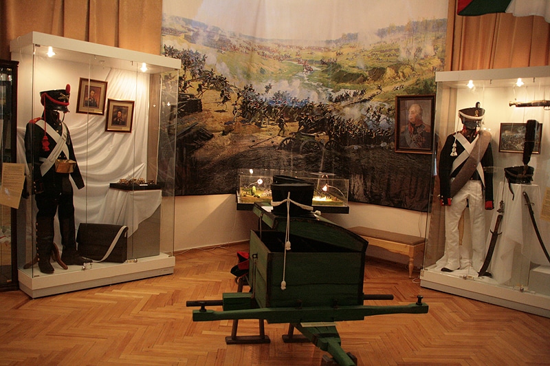 На выставке "Гроза 1812 года", которая заработала в Краеведческом музее еще в мае этого года, представлены некоторые вещи, имеющие непосредственное отношение к томскому полку, но, к сожалению, не подлинные, а воссозданные - "новодел", как говорт музейщики. Под потолком висит красно-зеленое и с двуглавым орлом посередине знамя полка, в витрине за стеклом - мундиры артиллериста и мушкетера. Если же говорить о подлинных вещах, оставшихся с тех времен, то в фондах музея хранятся медаль за взятие Парижа и медаль в память о войне 1812 года.