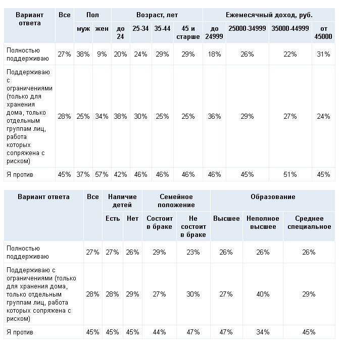 14% опрошенных (23% среди мужчин и всего 4% среди женщин), напротив, считают, что принятие упомянутого закона приведет к снижению количества правонарушений. В основном это зрелые респонденты: 18% россиян старше 45 лет против 7% опрошенных в возрасте до 24 лет.