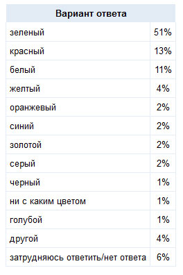 Оказалось, более половины опрошенных (51%) видят его зеленым, объясняя такое восприятие влиянием цвета американских долларов, купюр в 100 евро и российских банкнот достоинством в 1000 рублей. «Зеленый, как свет светофора»; «Цвет тысячных купюр и возможностей»; «Самая распространенная в России купюра в 100 евро – зеленая», - делятся особенностями цветовосприятия респонденты.