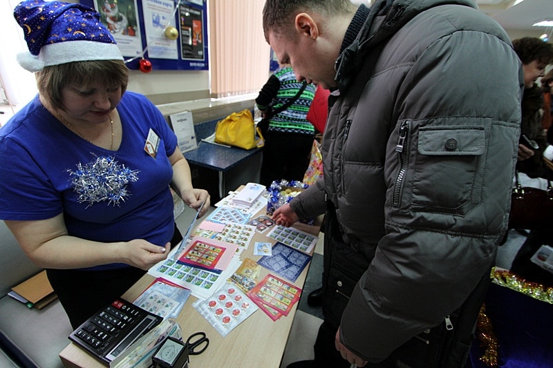 Всеобщее внимание привлек мужчина, пожелавший, чтобы ему поставили штемпели на листе новогодних марок: