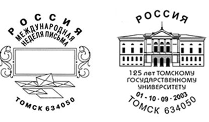 И еще немного из истории спецгашений Томска. В 2003 году в городе был введен в обращение постоянно действующий штемпель «Международная неделя письма». Им можно погасить корреспонденцию одну неделю в году (в ту, на которую выпадает 9 октября). В 2003 году в Росии было введено в действие 24 таких штемпеля.