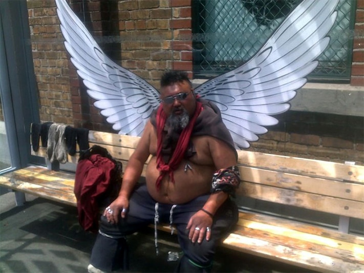 А на этом фото мужчина из Новой Зеландии непроизвольно поучаствовал в социальной акции «Стань чьим-нибудь ангелом»: крылья нарисованы на пластике, который является стеной остановки общественного транспорта: