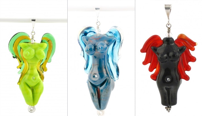 Странное видение ангела, у которого куда-то делась голова, но зато вполне ощутимы другие части тела, воплощено в подвеске из стекла (тоже ручная работа):