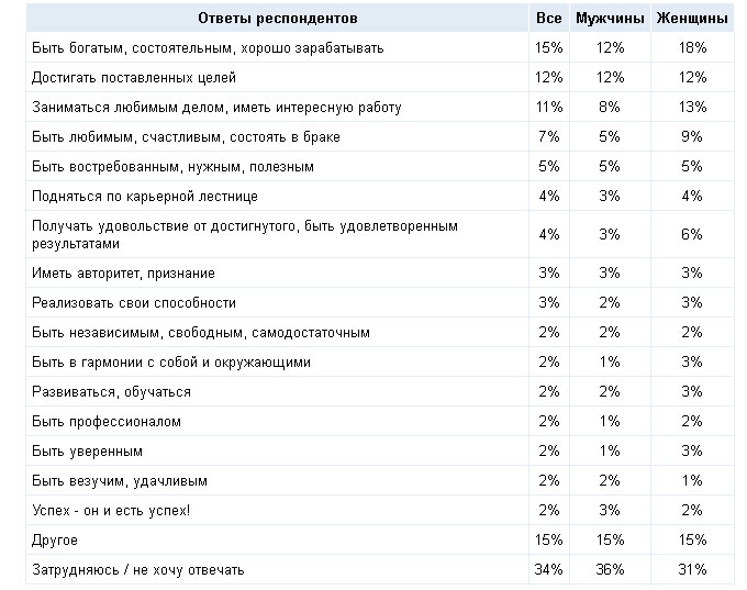 Все меньше респондентов считают главным в успехе карьеру (6% против 8% в 2006 году), семью и счастье в личной жизни (6%, семь лет назад — 9%), удовлетворенность от проделанного (5% против 11% в 2006), уважение, авторитет (5% против 9% в 2006), везение, удачу (4% против 7%), работоспособность (4% против 5%), а также самореализацию (3%), профессионализм (2%), стремление вперед (2%), востребованность (1%) и исполнение желаний (1%).