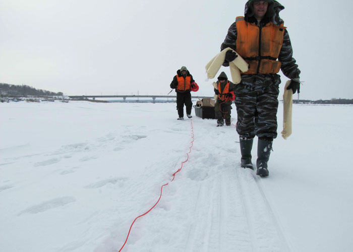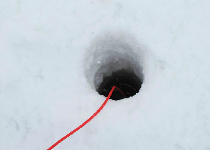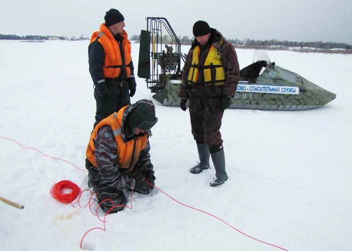 Чтобы расположить взрывчатку подо льдом, сначала необходимо пробурить лед. Делать это ручным рыбацким ледобуром очень затратно по силе и времени, поэтому специалисты используют мотобур - с ним дело идет быстрее.