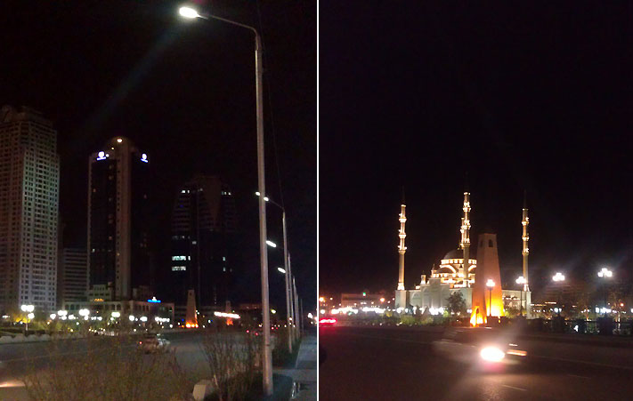 Удивительно, но город практически не подсвечен, а темнеет в нем рано. Свет есть только в районе Грозный-сити. Первое, что поразило, это отсутствие людей на улицах - кроме охранников госучреждений, людей мы практически, не встретили. При этом работающие магазины и кафе с посетителями попадались регулярно. Привыкнув к городу, мы через день уже гуляли ночью без сопровождающего. Причем променад в Грозном хорош - сказывается кавказский климат и очень чистый воздух, сидеть в помещение просто не хочется.