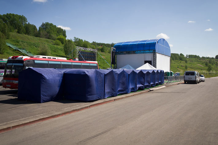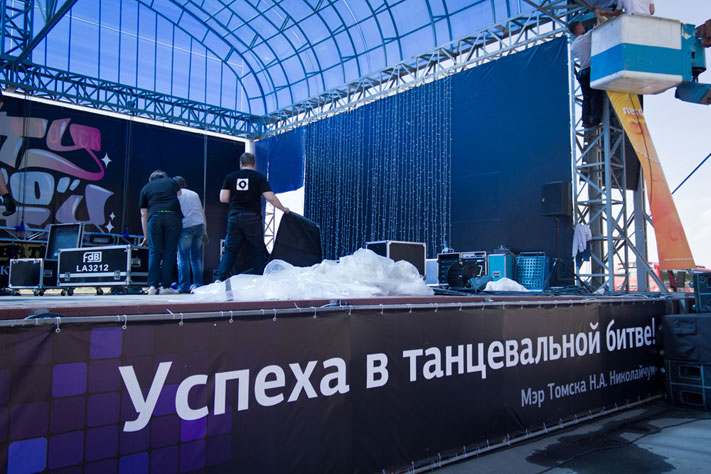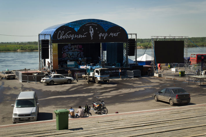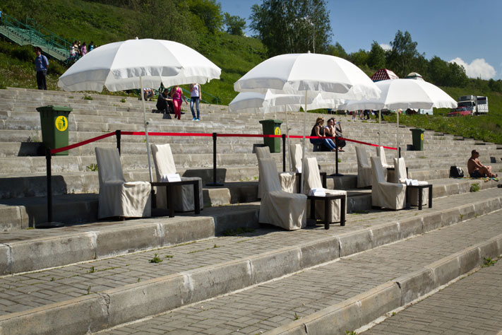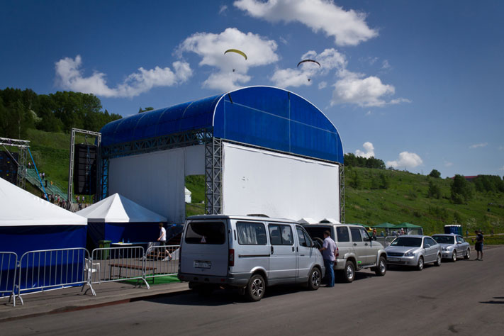 Площадку для участников в Лагерном саду готовили заранее: настроить свет, звук, оформить сцену, установить специальный экран - дело непростое и небыстрое. А еще было необходимо убрать и обустроить прилегающую территорию: поставить специальные кресла и большие зонты для жюри (шутка ли - провести весь день под непостоянным, но палящим сибирским солнцем), палатки с едой для участников, а, кроме того, расставить на всей территории урны для мусора.