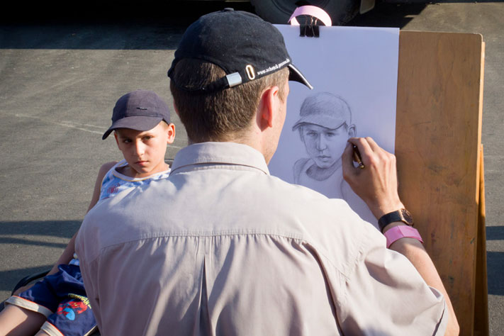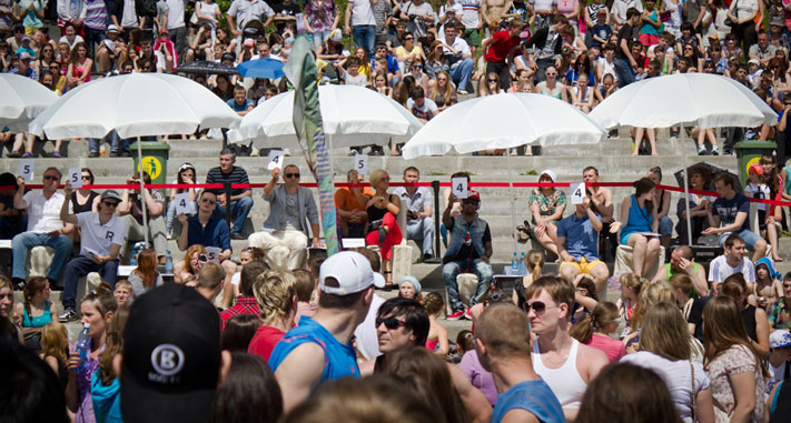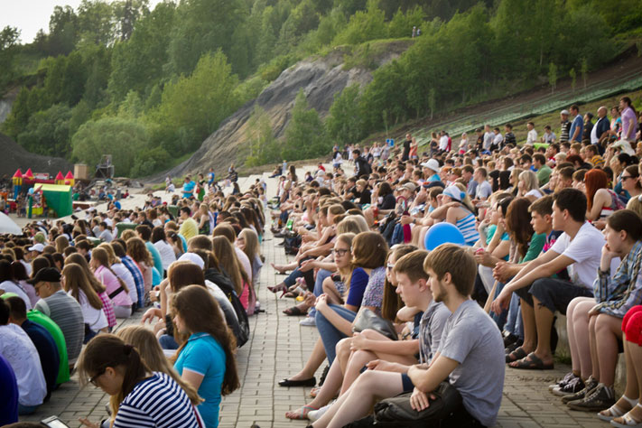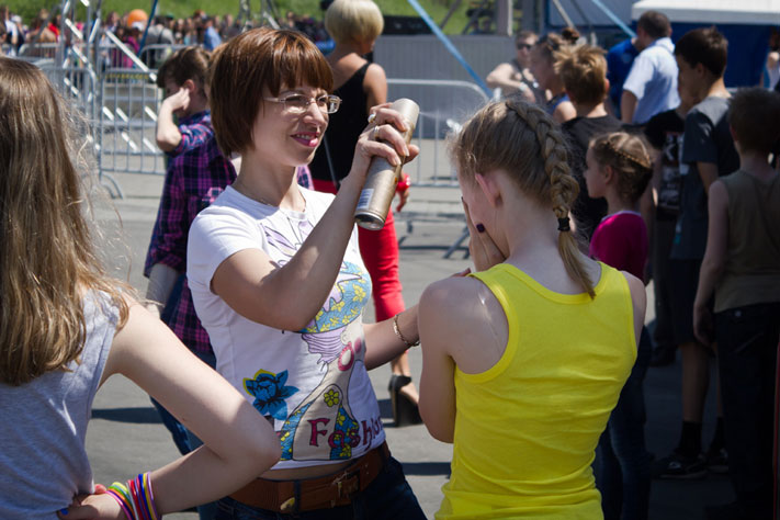 Желающие посмотреть на танцевальную битву начали собираться задолго до начала гала-концерта. Помимо традиционного «зрительского» набора вроде палаток с едой и бочек с квасом на нижней террасе в этот день предлагали свои услуги портретисты и даже специалисты по бодипаинту (к ним за помощью обращались и некоторые из участников).