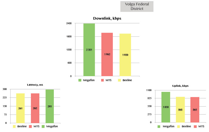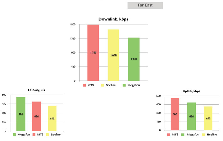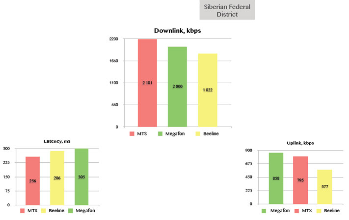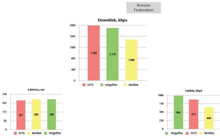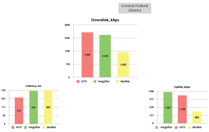 Рекордная средняя скорость загрузки данных на пользовательские смартфоны зафиксирована в сети МТС в Москве — 3272 килобита в секунду. Она обусловлена высоким уровнем покрытия сети 3G и активным развитием сети 4G. Также в расчет принимались и данные замеров в сети 2G, максимальная скорость передачи данных в которой составляет всего 512 кбит в секунду. МегаФон в Москве показал результат равный 3214 килобитам в секунду, Билайн -1804 килобита в секунду.