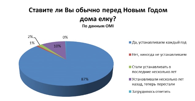 Подавляющее большинство респондентов устанавливают новогоднюю ёлку каждый год (87%). Перестали устанавливать ёлку несколько лет назад 10% ответивших на вопросы, а возобновили когда-то забытую традицию 2% интернет-пользователей.