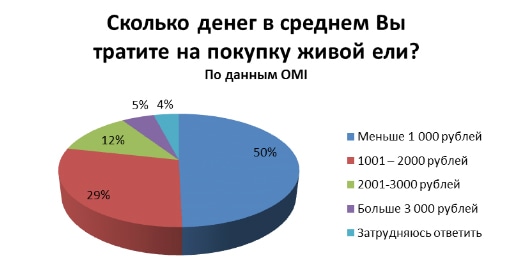Половина респондентов тратят на покупку живого дерева до 1000 рублей. Одна треть интернет-пользователей расходуют на покупку новогодней ёлки от 1001 до 2000 рублей. 12% опрошенных утверждают, что тратят на вечнозеленое дерево до 3000 рублей. И только 5% респондентов расходуют сумму больше 3000 рублей.