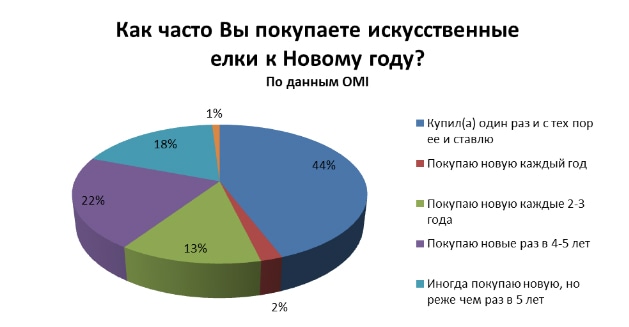 Расходы на искусственную ель оправданы, ведь по результатам исследования, почти половина опрошенных (44%) используют каждый год купленное однажды синтетическое дерево. Через 4-5 лет искусственную ёлку меняет 21 % респондентов. 18% ответивших на опрос позволяют себе новые расходы не чаще, чем раз в пять лет. Каждый год новую искусственную ель покупают 2% интернет-пользователей.