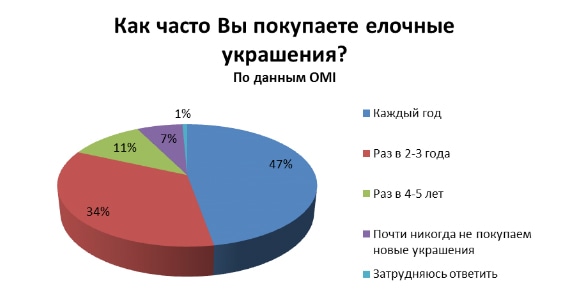 Как показало исследование, ёлочные украшения каждый год покупает почти половина принявших участие в опросе (47%). Более одной трети респондентов (35%) обновляют наряд для ёлки раз в 2-3 года. 11% делают это раз в 4-5 лет. 7% интернет-пользователей признались, что никогда не покупают новые украшения для новогодней ёлки.
