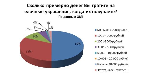 По собственным примерным оценкам половины респондентов затраты на ёлочные украшения составляют менее 1000 рублей. 32% интернет-пользователей расходуют на «ёлочные наряды» от 1001 до 2000 рублей. От 2001 до 3000 рублей могут себе потратить 10% опрошенных. Для 5% респондентов эта статья расходов варьируется в диапазоне от 3001 до 5000 рублей.