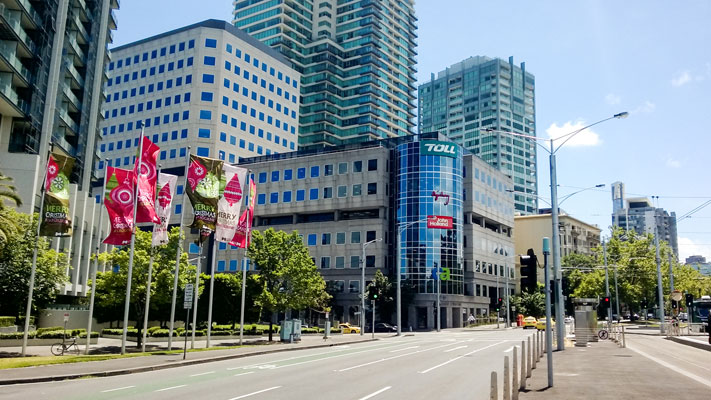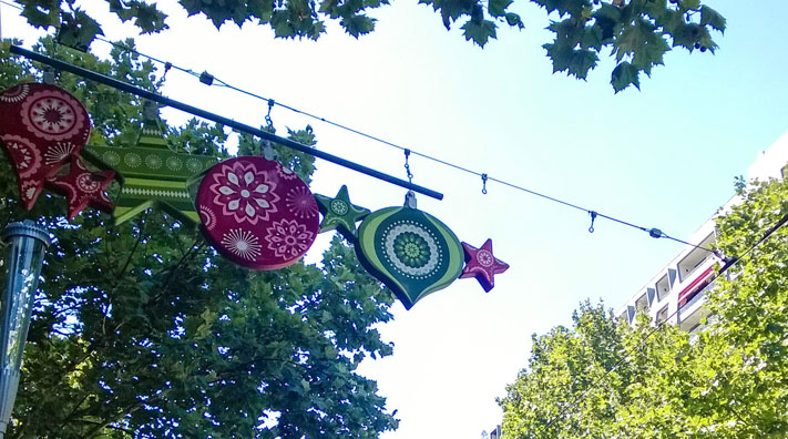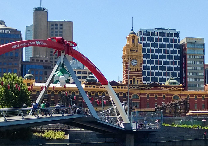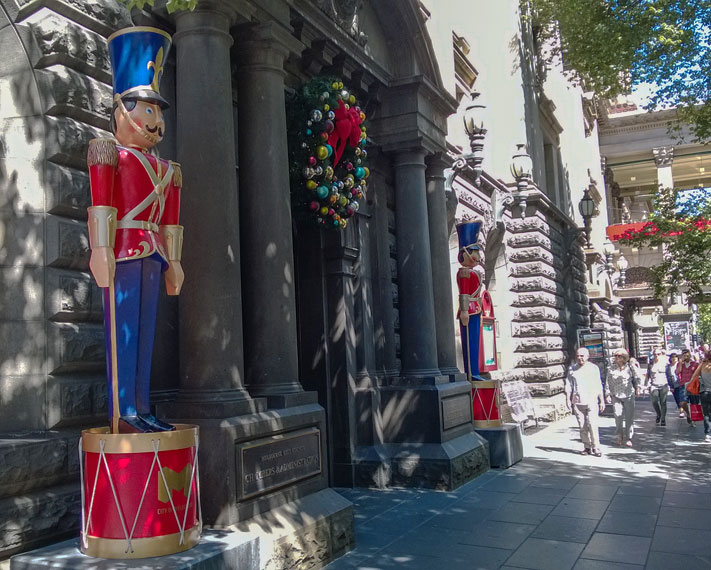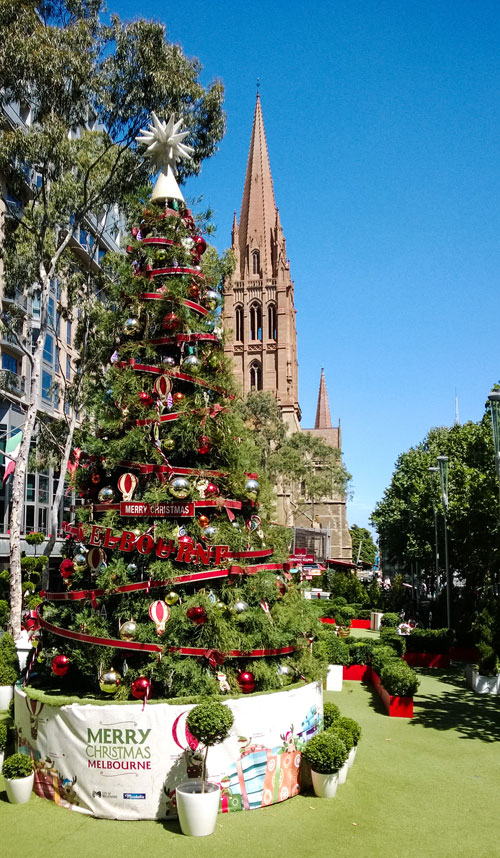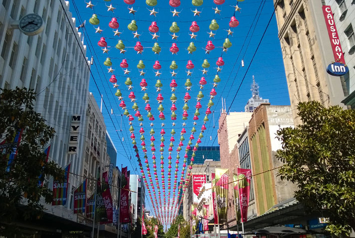 В крупных городах не развешивают праздничной иллюминации на каждой встречной опоре освещения, но стараются украшать экстерьеры зданий ближе к центральным туристическим местам. В Мельбурне часть одной из центральных улиц города — Bourke Street — выглядит таким образом: