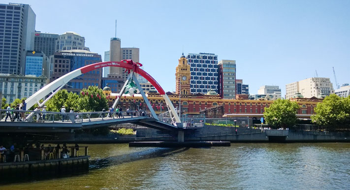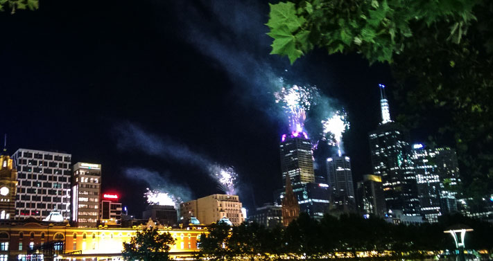 Новый год в Мельбурне собрал почти полмиллиона людей в центре города, которые с удовольствием закупались светящимися шапками, палками и прочими ерундовинами у уличных торговцев и таращились на представления жонглёров, музыкантов и живых статуй.