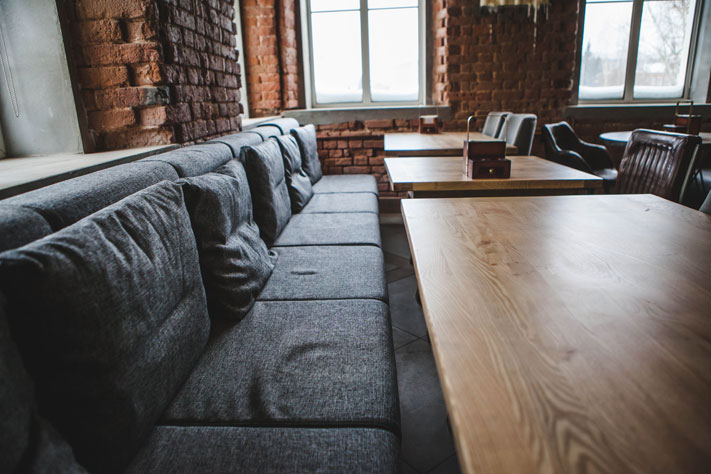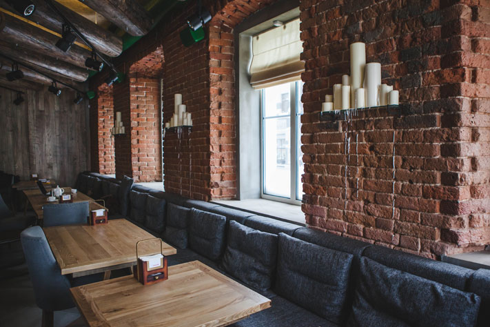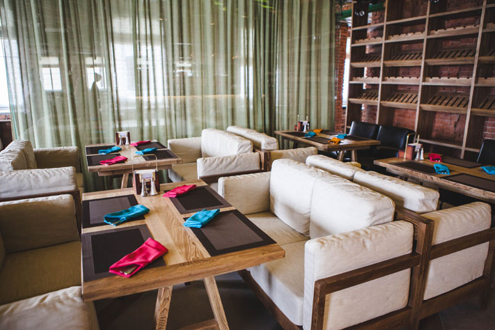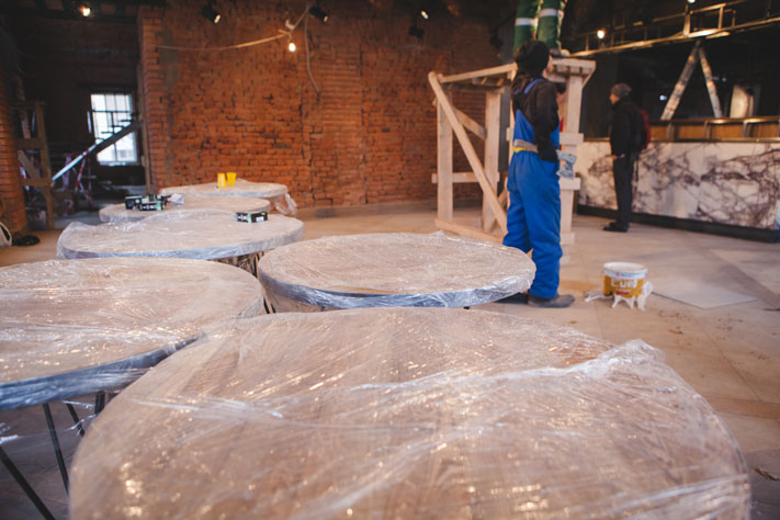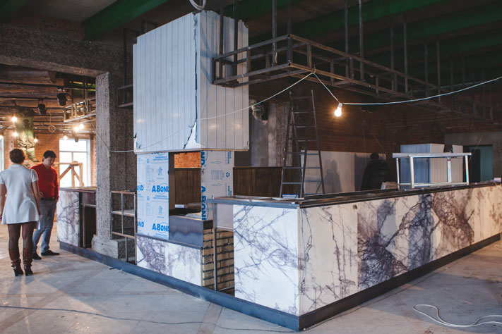 В ходе работ выяснилось, что в помещениях нет ни одного прямого угла — стены упорно отказывались сходиться под углом в 90 градусов. С этим пришлось повозиться, как и с планом посадки и размещением открытой кухни в центре зала, ведь общая площадь этажа не так уж и велика. В результате, удалось разместить в общей сложности, больше сотни посадочных мест в различных вариантах: